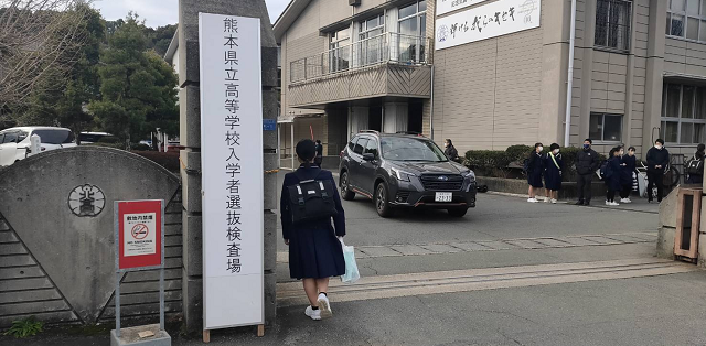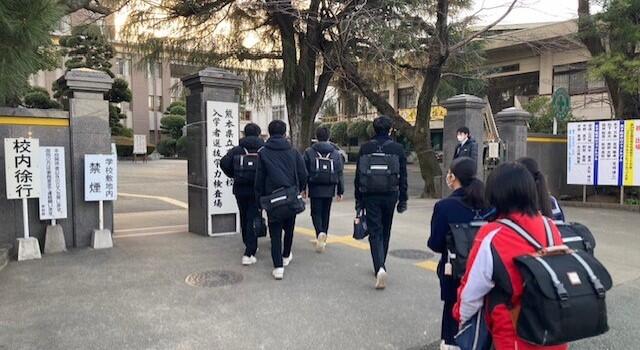 本日も、公立高校等の後期(一般)選抜の受検会場を撮影しました。写真は、本校生徒が最も多く受検している熊本北高で、引率している 益﨑 先生が送ってくれました。現時点(8:20)でトラブル等の報告はありません。なお、本日の熊日新聞1面の試験会場に入る受験生の写真は、本校の生徒たちです(構図は昨日の「楓の森の舎窓から」とほぼ同じ)。後姿なので、本校関係者にしか分かりませんが‥‥。