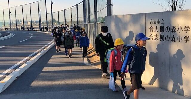 御代志方面から通学してくる児童生徒が利用する北通用口付近を撮影しました。ご承知のとおり、御代志駅付近は再開発の工事が進んでいます。これが完成すれば、本校区の御代志方面にもさらに住民が増えてくることが予想されます。すでに小学校1年生は5学級で、本校舎設計の際に想定してた1学年4クラスを超えています。創立2年目にして、教育委員会内では、もう校舎増築の話が持ち上がっているそうです。