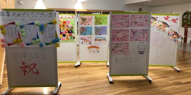 1階の東ロビーには、小学生からの卒業を迎える3年生へのメッセージ等が掲示されています(詳細は小学校ホームページをご覧ください)。このような心温まる場面が見られるのも小中校舎一体型のメリットです。この2年間にあったたくさんの小学生・中学生の交流が、3年生の心を豊かにしてくれたに違いないと思っています。