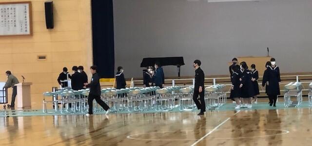 始業前、体育館で卒業式の練習のための準備をしている生徒会の元執行部役員や元委員長の様子を撮影しました。こんな時、パッと集まってサッと作業できる。本校3年生の精鋭たちには、役員等の引退後もやっぱり頼りになる人材が揃っています。第3学年主任の 深水 先生もきっと気持ちが良いことでしょう。
