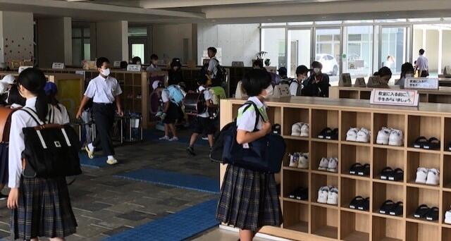 中体連2週間間の、みんなの玄関を通過する生徒たちの様子です。中には、通学カバンともう一つ大きな部活動用のバック(パック)を抱えて登校する生徒がいます。その多くは部活動生です。