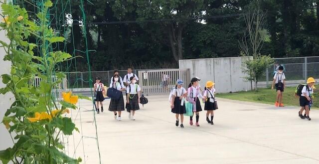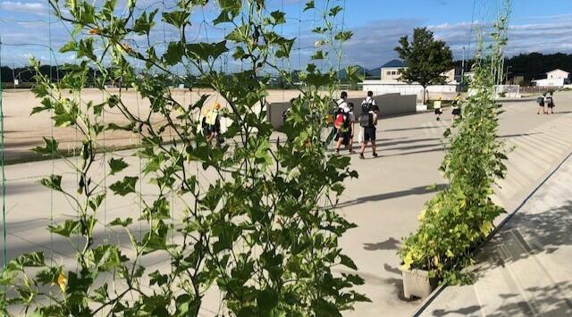 職員室前のベランダから東門方向を撮影しました。緑のカーテンにしている観賞用のカボチャも背丈ぐらいに伸びてきました。本日は曇の天気予報で、気温はそれほど高くないですが、湿度が高くムシムシしますね。もはやエアコンは熱中症対策に必須のものになってきていますが、省エネとのバランスはとっていく必要があるかもしれません。