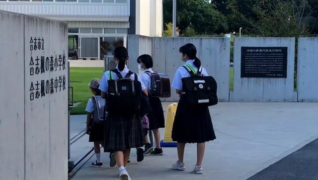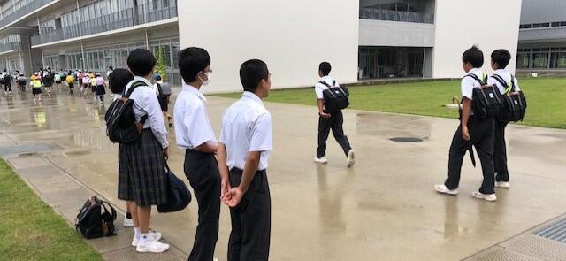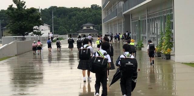 校舎(特別教室棟)とプール(給食棟)の間を通って登校してくる御代志方面の児童生徒の「合志のみち」付近の様子を撮影しました。傘を手に持っている生徒は、下校時には傘を差して帰ることになりそうです。