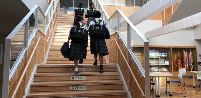 東ロビーから東の中央階段を見上げるように撮影しました。主に中学1年生と小学6・5・4年生がこちら側の階段を利用します。