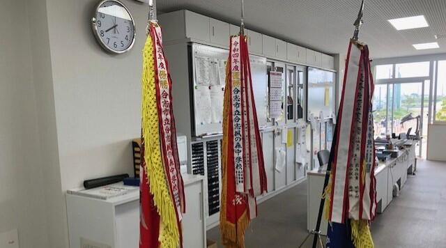 また、右端に優勝旗が5本飾ってあるのが見えるでしょうか? このうち3本は昨年度中体連大会(郡市・県)で社会体育の空手道が獲得したもので、「一旦は」返還することになりますが、また戻ってくる(4本になって)ものと思っています。併せて、本校部活動の種目の優勝旗が何本か並ばないかな‥‥。私(校長)の教職最後の年に花を添えてくれる部活動が表れることを、煩悩を捨てきれない私は、正直期待してしまいます。