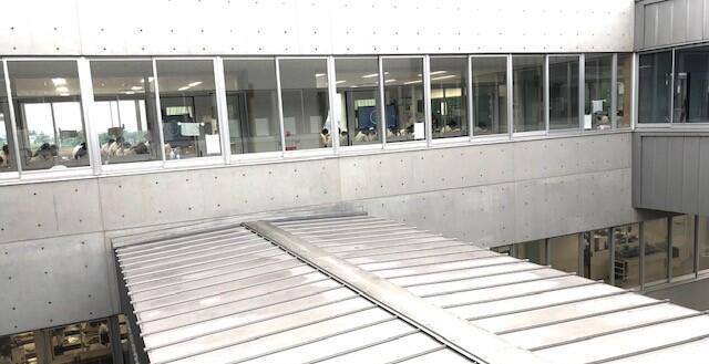 特別教室棟3階廊下(生徒会室前)から、普通教室棟の3年生教室方向を撮影しました。現在、奥の3年生教室では、実力テスト2日目の社会のテストがあっています。手前に見えるのは、生徒たちは「空中教室」と呼んでいる少人数指導用の教室です。