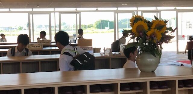 私(校長)が、人工膝関節置換手術を受ける前(約2ヶ月前)、学校園に種をまいたヒマワリの花が咲き始めました。花粉の出ない切り花用タイプで、これからどんどん咲いてくるので、玄関だけでなく小学校を含めた各教室にも飾ってもらえればと思います。