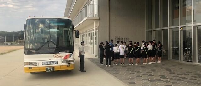 朝の7:00。本日、えがお健康スタジアム周辺で開催される菊池郡市中体連駅伝大会にへ出発する男女駅伝チームの選手たちが集合していました。