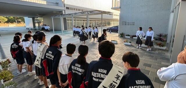 本年度の生徒会役員選挙が公示され、各立候補者の選挙運動が始まりました。写真は「こうしの道」側で呼びかけを行っている1年生の立候補者と応援の生徒たちです。なお、2年生は東門で行っており、明日は交代です。