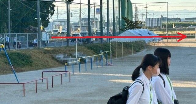 職員室前ベランダからローソン前交差点方向を撮影しました。昨日の安心安全メールでもお知らせしましたが、サルが本校周辺に出没しています。後藤 先生の話では、2匹のサルが、恵楓園の森から道路を渡り、テニスコートから野球場、学童保育の方へと移動したそうです(写真の赤線のように)。もし出会っても、刺激などせず、安全な距離をとって、すぐに警察へ連絡をお願いします。