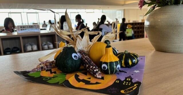 みんなの玄関の靴箱の上には、ハロウィン用に飾りつけた「おもちゃカボチャ」や「レンボーコーン」などが置いてあります。これは特別支援学級担任の 川内 先生(教員免許は美術)の仕業ですが、本校舎内では、この他にも小学校の先生によるハロウィン仕様がたくさん見つかります。