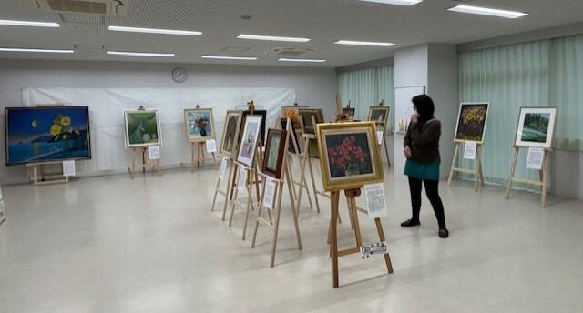 「金陽会」作品展を開催している地域交流室を撮影しました。本時もキュレーターの蔵座さんが、同室に待機して鑑賞しに来た生徒たちへ解説等をしていただきます。なお、明日明後日が、同作品展の一般公開があります(詳細はこちら)。ぜひ学校にお越し頂き、作品をご鑑賞いただければと思います。