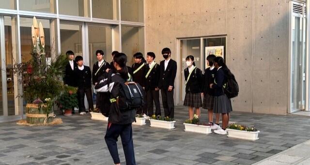 みんなの玄関の北側入り口では、生活安全委員会の生徒たちが、あいさつ運動に立ってくれていました。よく見ると、2年・1年の新役員や新委員長が決まった今も、3年生の同委員会の生徒たちがきっちり参加してくれています。このような責任感の強い生徒は、きっと将来もそのことが周りの人々に認められ、自己実現の手助けになってくれるものと思います。とは言え、後期後半には完全引退となりますので、あとは自分の進路選択に専念してもらいたいと思っています。