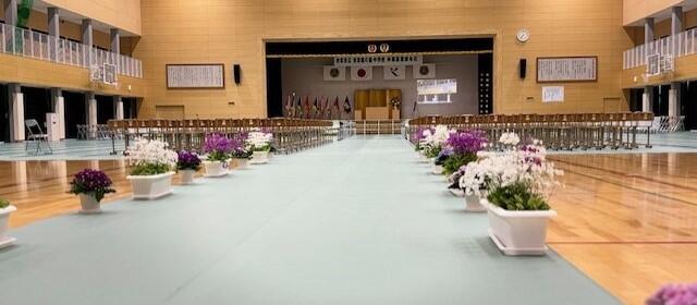 朝の7:30。令和5年度第2回卒業証書授与式の準備が整った体育館を撮影しました。昨日、1・2年の生徒たちや先生方が準備を頑張ってくれたおかげで、厳粛な中にも華やかさのある式が挙行できそうです。会場を飾っているサクラソウ(プリムラ・マラコイデス)は、小学校の米澤教頭先生と用務員の田尻先生が大切に育ててきてくれたものです。
