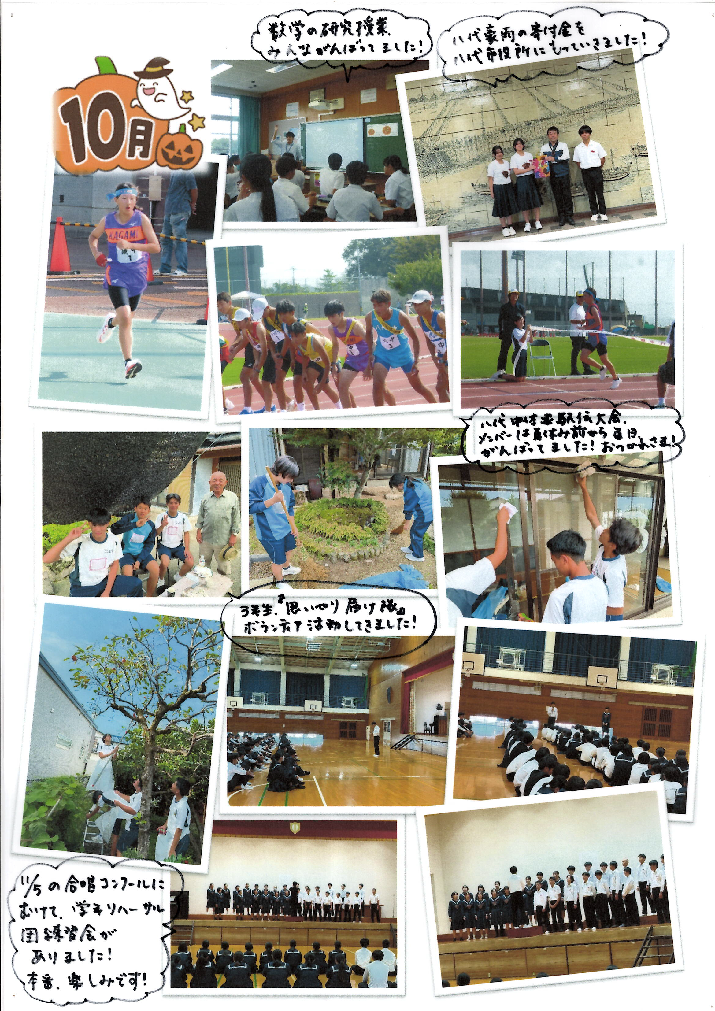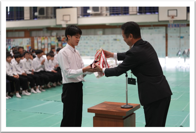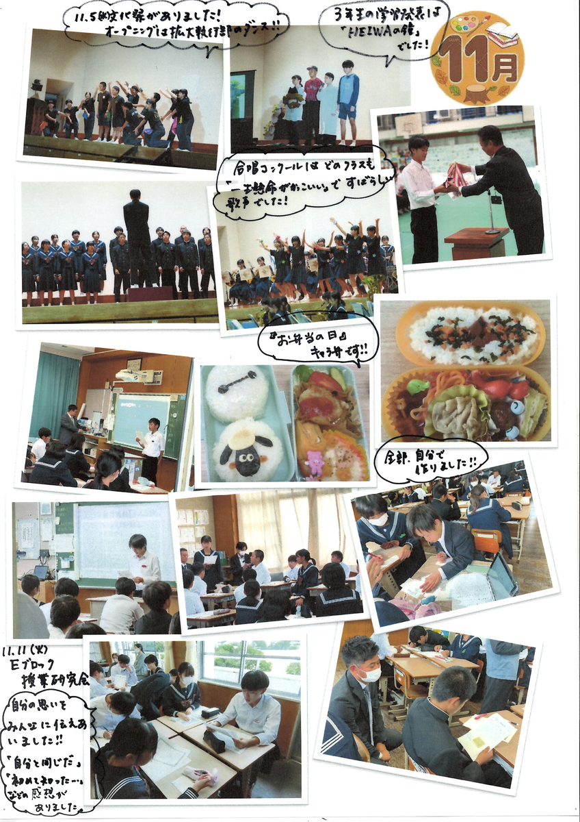 オープニングで拡大執行部のダンス発表があり、3年生の学習発表「HEIWAの鐘」があり、当たり前に過ごしている毎日の平和な暮らしが“奇跡”だと感じることができるような、沖縄戦の劇の発表でした。その後の合唱コンクールでは、2学期に入って、各クラスで練習してきた課題曲、自由曲の発表がありました。どのクラスも「一生懸命はかっこいい」で取り組んできた歌声を体育館中に響かせることができ、とても素晴らしい合唱コンクールとなりました。