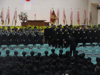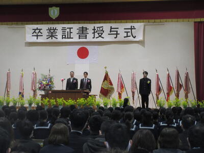 式では、吹奏楽部による演奏と在校生による合唱とともに卒業生が入場。卒業証書授与では、壇上で一人ひとり、凜々しい晴れ姿を見せてくれました。その後、たくさんのお祝いの言葉をいたただき、最後に卒業生から保護者へ感謝の言葉を述べて締めくくられました。心温まる素晴らしい卒業式でした。