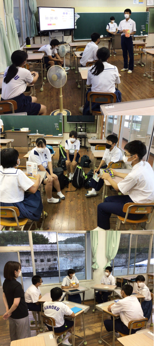 9月1日(木)、清流タイム。一昨日の生徒会各委員会を受けての生徒集会でした。三役、学級総務、学習図書、健康、情報、生活環境、体育安全の順に、各委員長が今月の目標や取組を説明してくれました。その後、3つの委員会(健康、生活環境、体育)合同で、「コロナ禍・猛暑の中で健康的に過ごすために」と題しての注意喚起や生活アドバイスもあり、生徒主体の有意義な時間となりました。