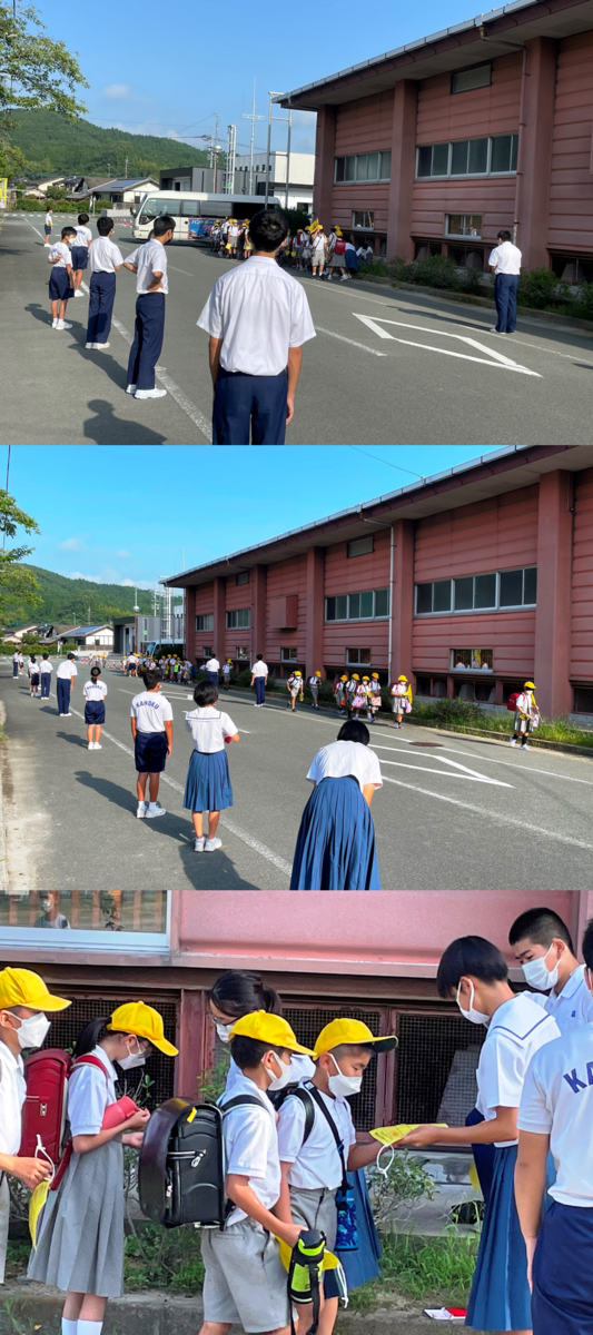 7月13日(水)の登校時間。6月30日(木)に生徒会長が示してくれたヒミツの企画がついに動き出しました。タイトルは「あいさつで鹿北を元気に大作戦」です。小学校との調整で開始予定が少々遅れましたが本日スタート。三役の面々は汗をびっしょりかきながら一生懸命取り組んでいました。弓道部の皆さんも通常のあいさつ運動で盛り上げてくれました。