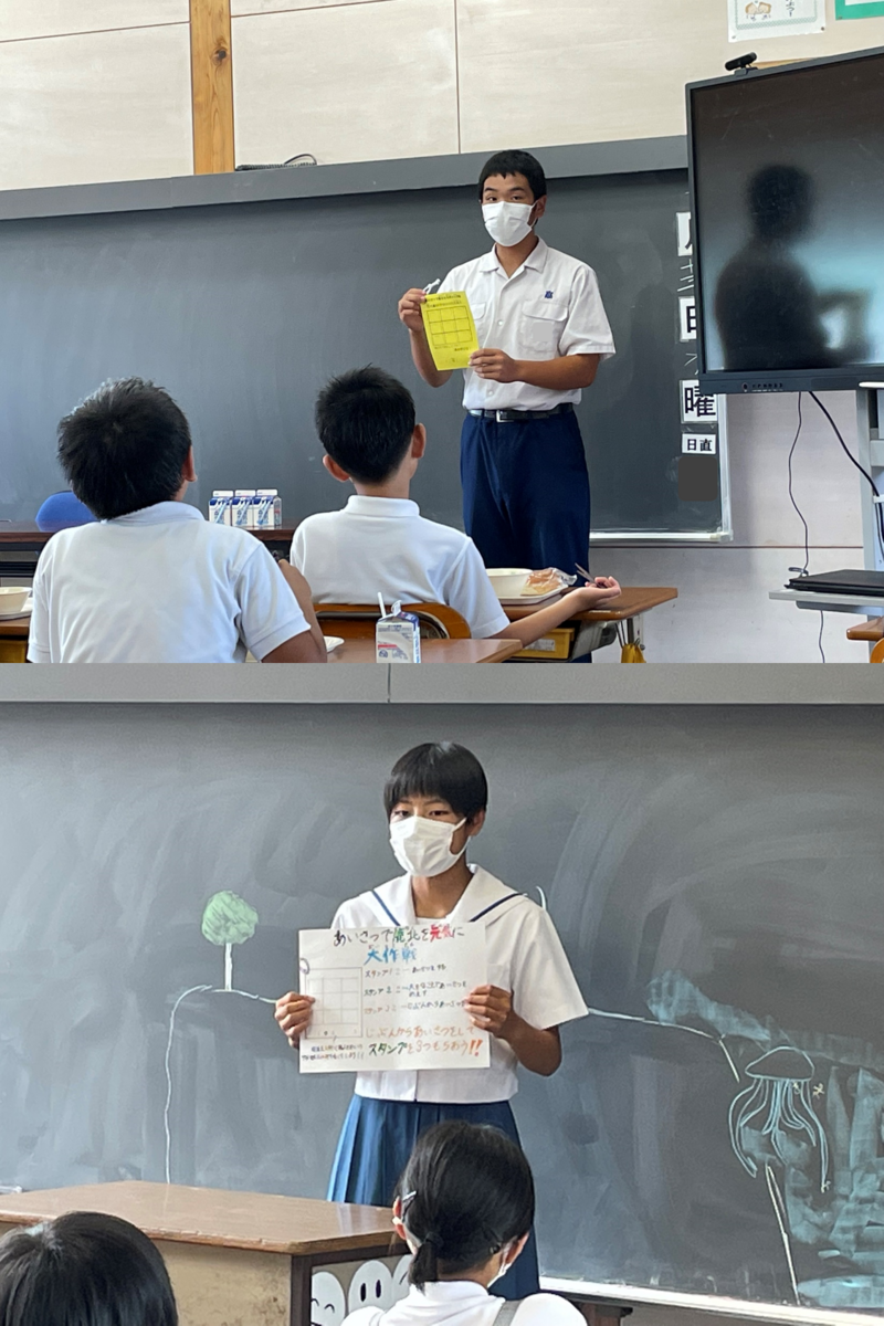 7月13日(水)の「あいさつで鹿北を元気に大作戦」。実は、初日とあって小学生が少々戸惑い気味でした。そこで生徒会三役はどうしようかと考え、その日の給食の時間、小学校へ説明に行くことにしました。まず、みんなで教頭先生に許可をもらった後、それぞれが分かれて1年生から6年生の各教室へ向かいました。学年に応じた説明をする姿に頼もしさを感じました。小学生も一生懸命聞いてくれました。