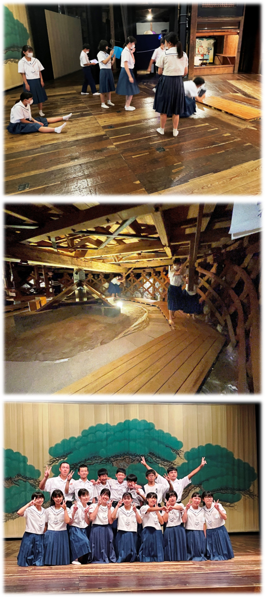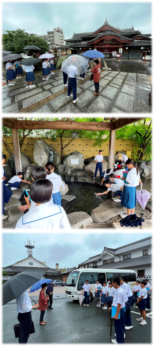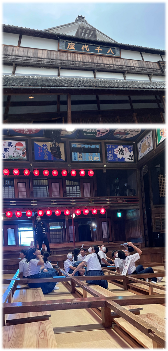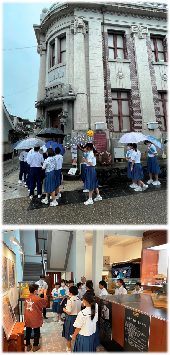 6月2日(金)の午前中、2年生が山鹿市歴史探検バスツアーに出かけました。あいにくの雨天になりましたが、生徒たちは元気いっぱいでバスに乗り込み、山鹿市の中心部へと向かいました。到着後は八千代座、山鹿灯籠民芸館、さくら湯などを見学。八千代座では奈落で廻り舞台を動かしてみるなど、普段はなかなかできない体験をさせていただきました。それぞれが山鹿のよさを再発見したようで、現地で学ぶ重要性を改めて感じました。