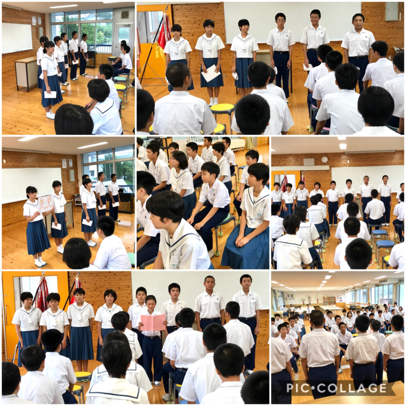 9月19日(木)、県中体連陸上競技大会の選手推戴式を給食の時間に行いました。横田さんは、先日の山鹿市中体連陸上競技大会1年女子100mで2位となり、山鹿市代表として県大会に出場します。