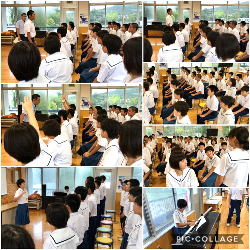 9月20日(金)の放課後、体育館にて、全校生徒で「山のいぶき」の練習をしました。指揮者の生徒会長が歌った後、気づきを伝え、修正しながらの練習です。練習を通して、「なぜ鹿北中は山のいぶきを歌うのか」、「どんな思いを込めて歌うのか」、「どんな思いを伝えたいのか」など丁寧に考え確認しながらの練習です。練習を重ねるごとに、思いが込められていきます。