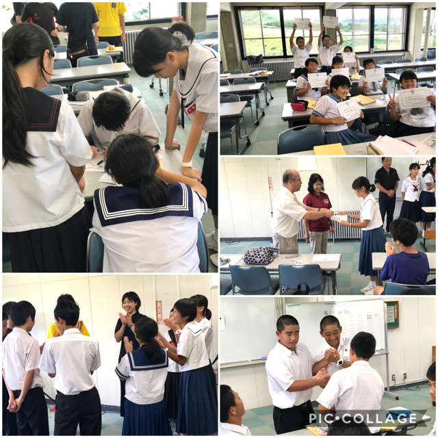 そして、いよいよ結果発表。ドキドキの瞬間です。各学年上位2校の発表でしたが、残念ながら鹿北中の名前は呼ばれませんでした。しかし、部活動やサマースクール、陸上練習と並行しての暗唱の練習、みんなの頑張りは入賞に値するくらいすばらしいものであることは間違いありません。何かをやり切ることで得られる喜びや悔しさ、達成感や充実感。そんな尊いものを英語暗唱を通して感じたことと思います。