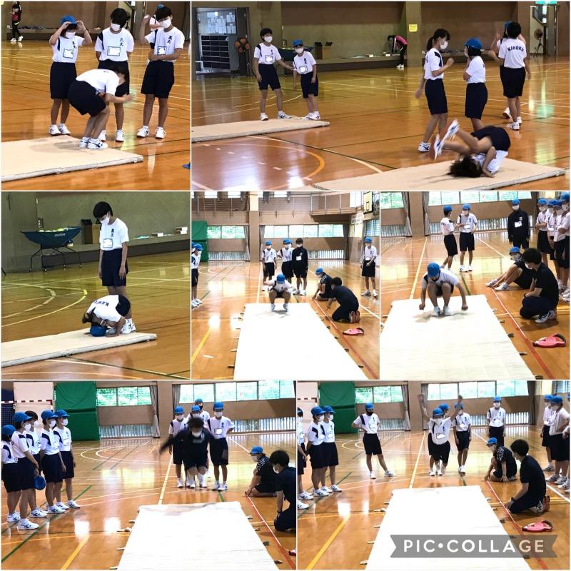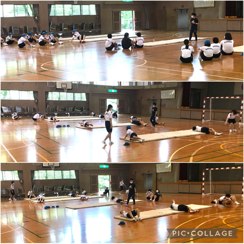 体育館では、1年生の体育の授業が行われていました。立ち幅跳びの記録測定やマット運動を行ってました。立ち幅跳びでは、2メートル以上跳んだ時などどよめきがおきていました。マット運動では、体の柔らかさや平衡感覚などが要求されると思いました。みんな一生懸命頑張っていました。