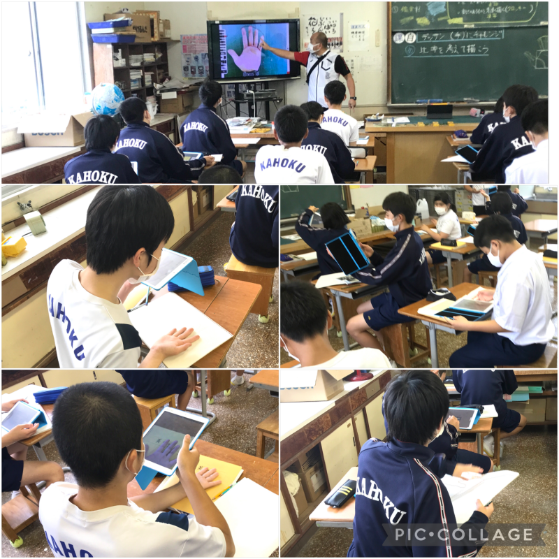 2年生の美術の授業では、自分の手を描く授業。描く時にポイントなどの話を聞いた後、さっそく描くかなと思ったら、何とタブレットで自分の手を写真に撮ってタブレットを見ながら描き始めました。こんなところでも、タブレットが活用されていることに驚きました。美術も集中して頑張っていました。