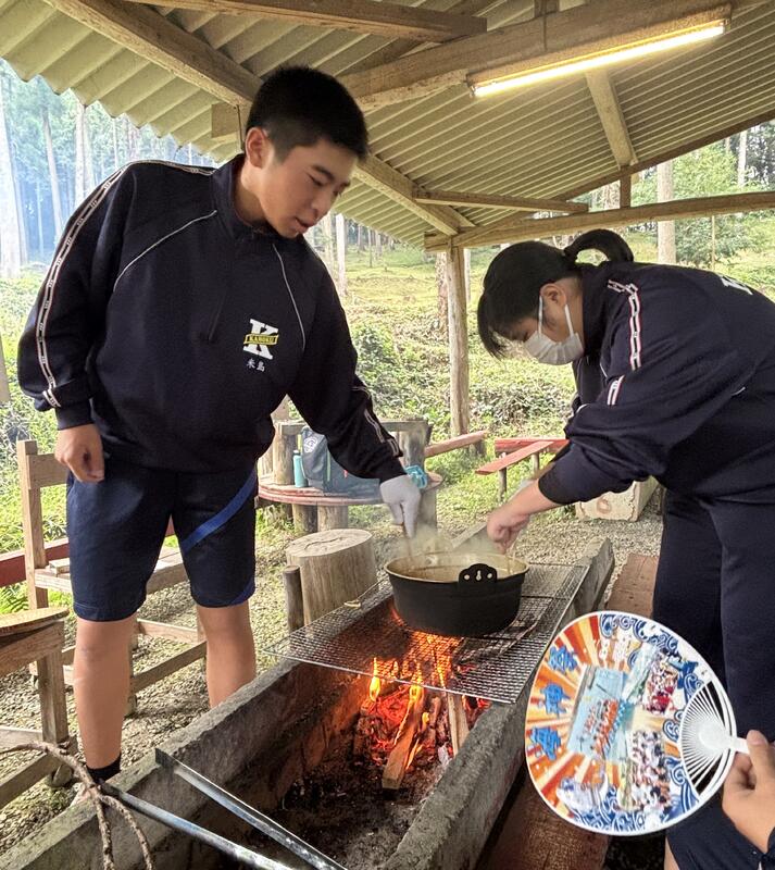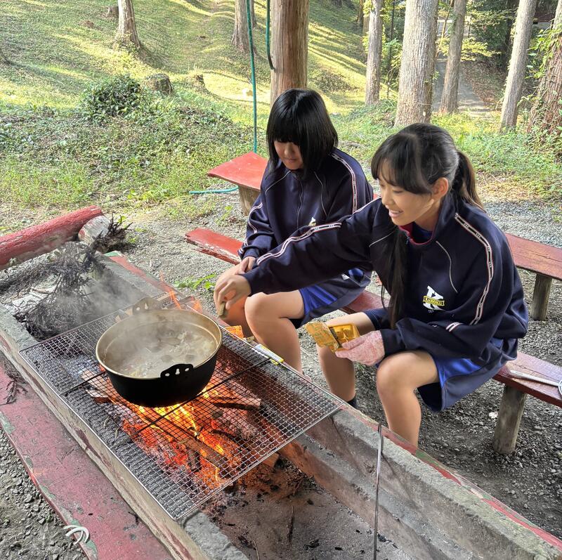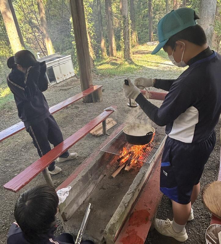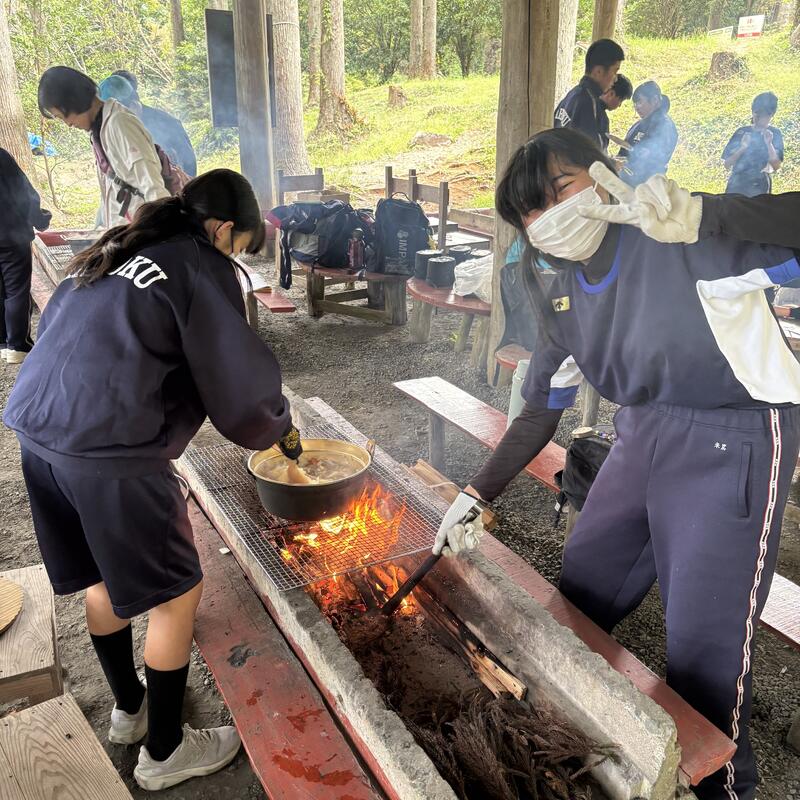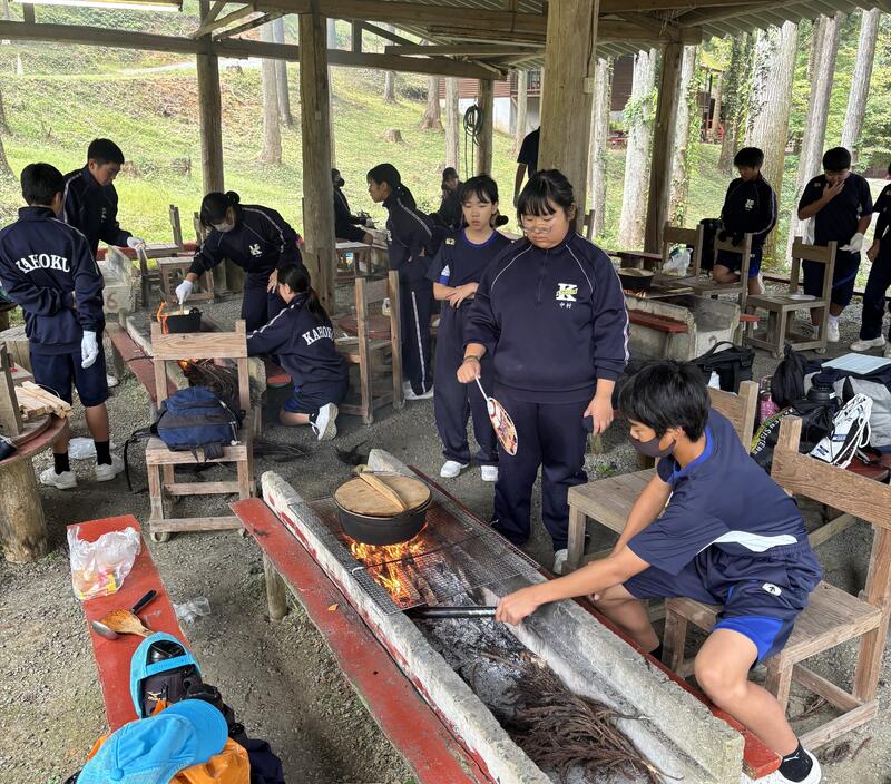 本日1年生が地域への理解を深めるため、野外活動(炊飯体験)を岳間渓谷キャンプ場にて実施しました。班ごとに協力し、カレー作りです。上手にできるか心配しましたが、役割分担をしていました。火の様子を見る人、人参やジャガイモが煮えているか確認する人、煙が目に入り痛がっている人・・・さまざまです。