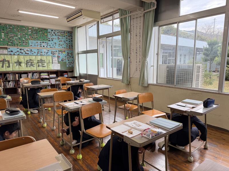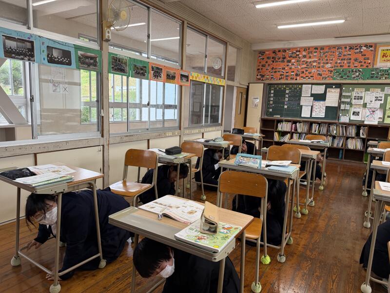 さて、本日10時に防災への意識高揚のため、訓練放送が山鹿市内全域に流れました。災害はいつ起きるかわかりません。日頃から意識を高く持つことが重要です。1年生は技術の授業中でしたが、机の下に潜り、訓練に急遽参加しました。予告のない中での訓練でしたが、しっかり机の脚の部分を握って、潜っています。すばらしいです。自分の命や周りの命を守るために、的確に行動できるようになりたいものですね。