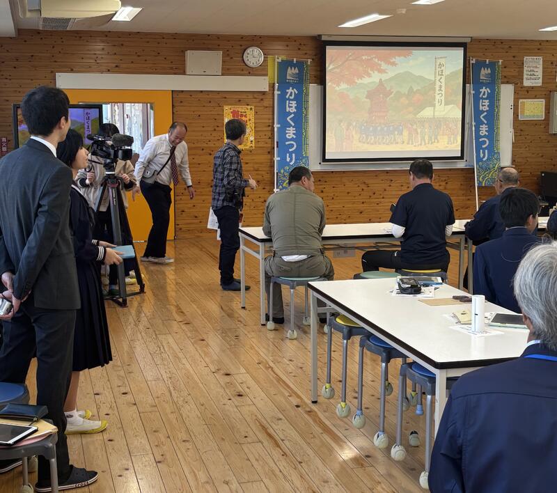 11月12日(水)朝から気温も低く、冬が近づいています。鹿北小学校のグラウンドでは、週末に開催される「かほくまつり」のステージやテントの準備が進んでいます。