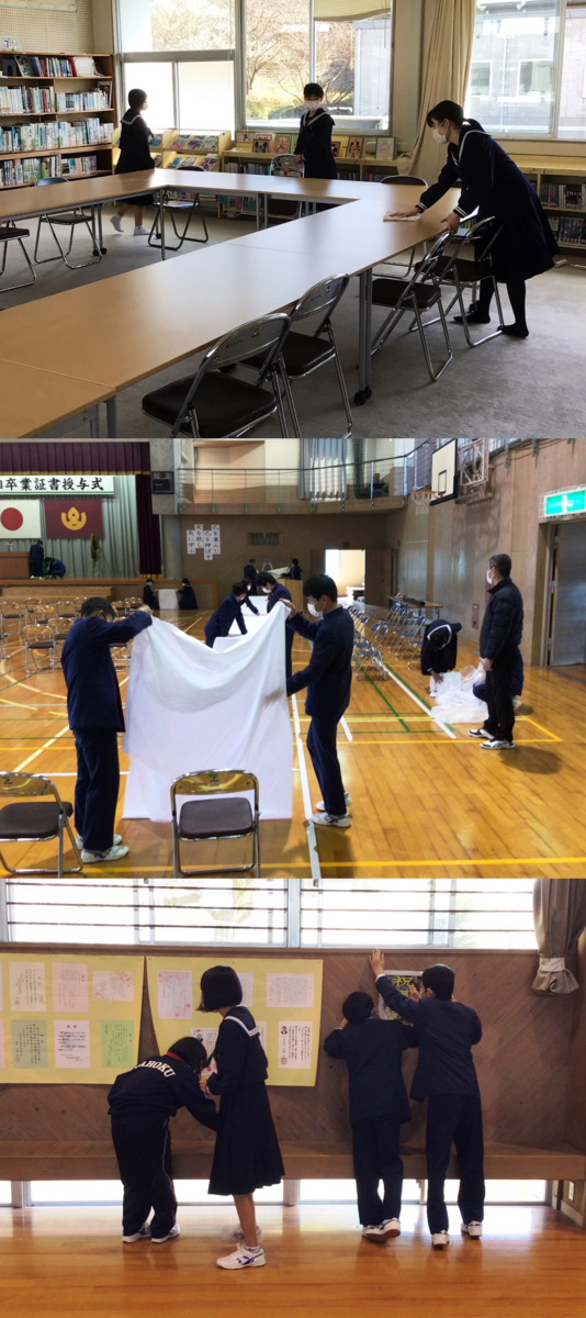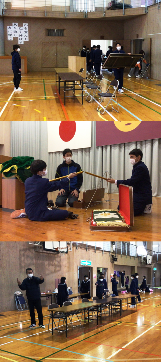 4月10日(月)の2~3校時は、入学式の準備と練習でした。まずは2・3年生の生徒が係に分かれ、担当の先生と一緒に会場づくりを行いました。大きな体育館を少人数で設営しますのでたいへんですが、生徒たちがよく動き1時間弱で会場が整いました。そしてリハーサル。時間も限られていますので流れの確認を中心に行いましたが、みんなが集中して参加してくれましたので短時間で終了しました。これで準備は万端。明日が楽しみです。