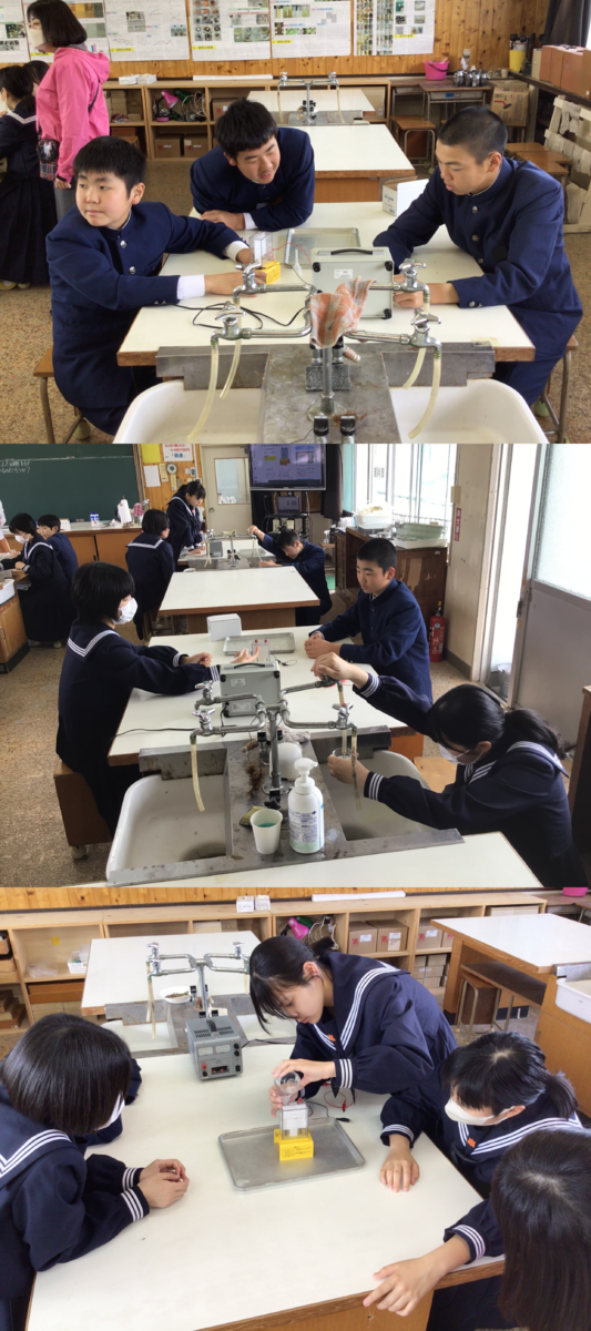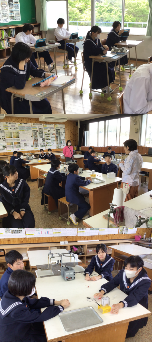 5月28日(火)の5校時。1年生は英語の授業でした。先生とやりとりしたり、ペアで友だちとやりとりしたりと、教室中に英語が飛び交っていました。2年生は理科の実験中。鉄と硫黄の混合物を加熱しできた物質について調べていました。塩酸を加えてみると…。すさまじい匂いに、みんな顔をしかめていました。3年生は数学です。因数分解の応用を学習していました。自分で考えたり、友だちと教え合ったり、先生に聞いたり…流動的に動き回りながら学習していました。運動会、台湾交流と大きな行事を終え、学校も落ち着いた日常に戻っています。