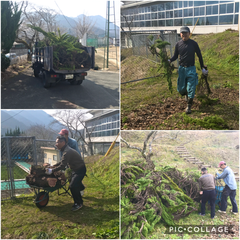 2月11日(火)、午後1時より保護者の皆さまに、グラウンドに下りる階段付近に並んで立っているカイズカイブキの伐採を行っていただきました。