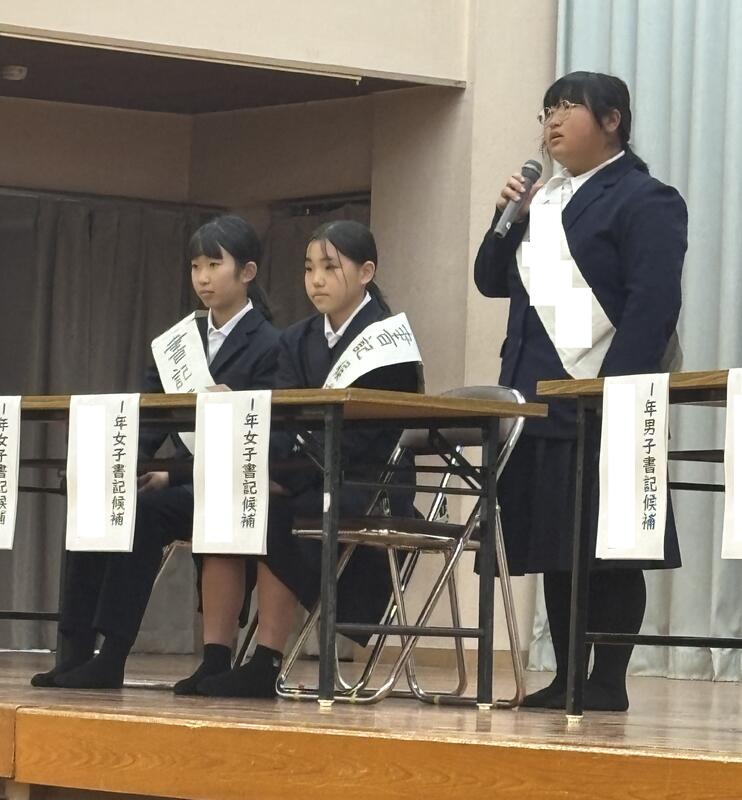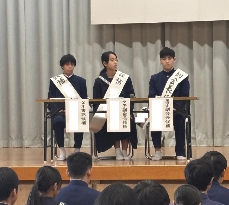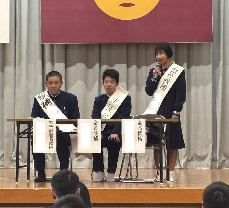 本日3、4時間目に生徒会選挙討論会を開催しました。小学校6年生も参加し、一票を投じます。例年、立候補者と応援者による立会演説会を実施していましたが、本年度は立候補者のみで討論会形式に変更しました。選挙管理委員が進行を務め、立候補者の意見や思いを引き出します。聞く側も自分の一票を誰に投じるか・・・真剣に参加し、意見を出すことができました。