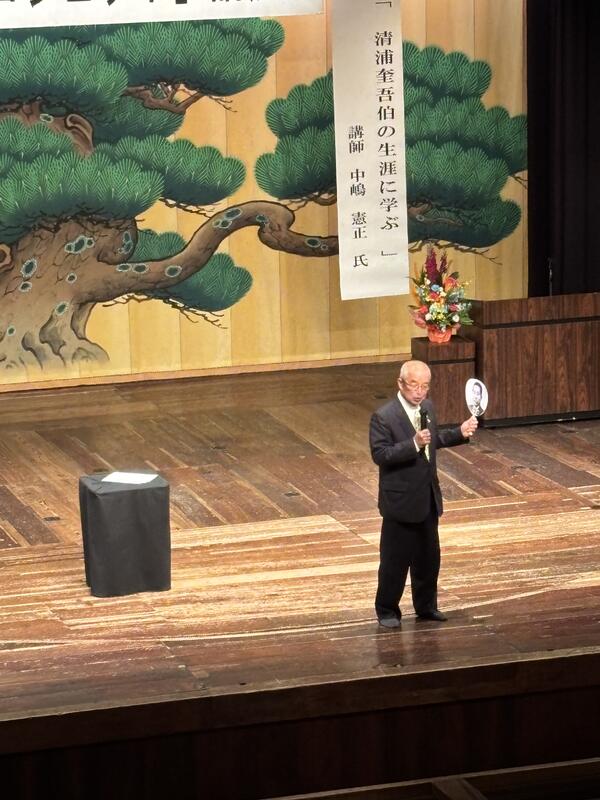 講師は前山鹿市長の中嶋憲正氏。「清浦奎吾伯の生涯に学ぶ」と題し、熱く中学生に向けてメッセージをいただきました。目標を持つ大切さや人と人との出会いの中で学び育つことなど、今後に役立つお話しでした。