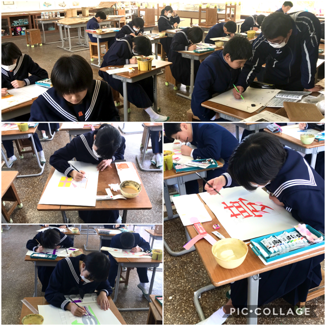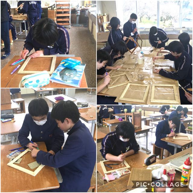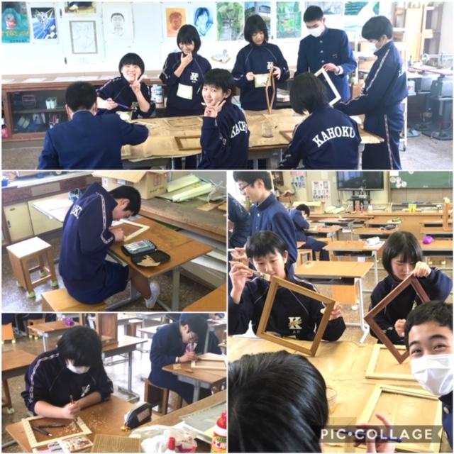 6時間目は、3年生が「色紙入れ」を製作していました。卒業制作となります。彫刻刀で模様などを完成させた生徒は、集まって楽しそうにニスを塗っています。そんな3年生の姿を見ていると、「ああ!もうすぐ卒業なんだ」と気づかされます。