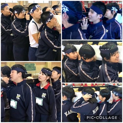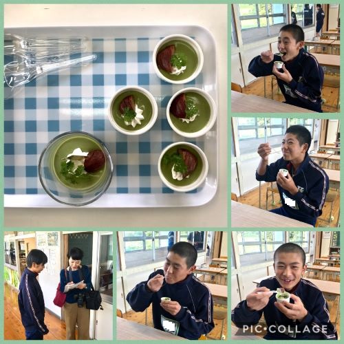 総合の時間前半は、鹿北の代表的な農産物である「お茶」と「栗」を使ったスイーツを生徒が考案し、地元の「ゆ~かむ」さんとのコラボレーションでの試作品が完成したので、3年生全員で試食会をしました。甘さ控えめですが口の中に抹茶の香りが広がります。そして、栗を食べると今度は栗の甘さが広がってきます。鹿北の秋を感じさせてくれるスイーツの完成に笑顔が広がります。これから名前を決めたり、いくらで販売するかなどの話し合いを行っていくことになりますが、どんな名前になるのか、とても楽しみです。