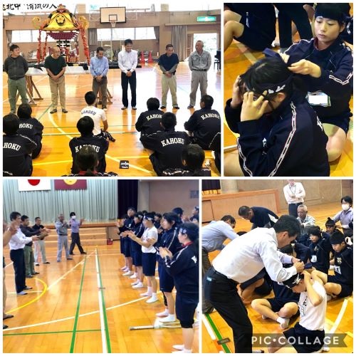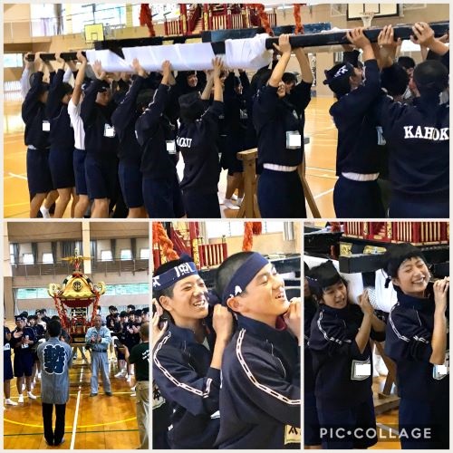 鹿北の北勢会のメンバーの皆さまにご指導いただき練習開始です。最初に三本締めを行い、かけ声と笛の合図で神輿を担ぎます。「ズシン」と肩に重みが伝わります。そして足を動かしながらリズムをとり、少しずつ前に進みます。何度も神輿を担ぎましたが、前回の練習より上達したとお褒めの言葉をいただきました。まだまだ、練習が必要ですが、かほくまつり当日、鹿北グラウンドで神輿を担ぐ3年生の姿とともに、町の皆さまのたくさんの笑顔が見えてきました。