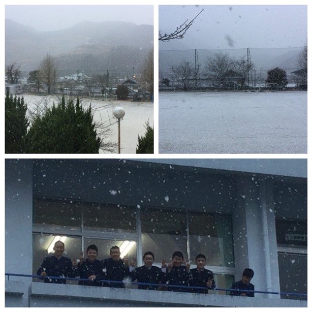 1月23日(月)8時30分、ふと外を見ると雪が舞っています。あっという間にグラウンドも白くなりました。寒い中、3階のベランダには3年生男子が出てきて、雪を見ていました。雪国の人たちとは違って、私たちは少しの雪でも何となくうれしいものです。だけど、3年生は明日も入試です。風邪やインフルエンザには十分注意をしましょう。