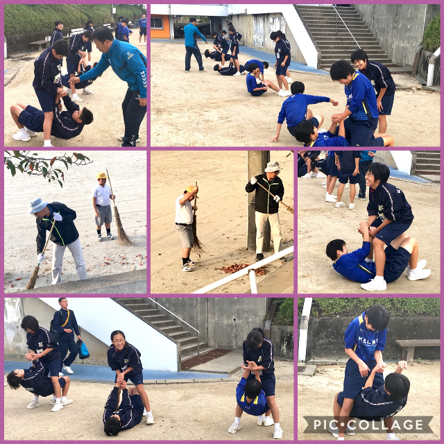 10月22日(月)新しい1週間が始まりました。朝の鹿北グラウンドでは、小学生と用務員さんが落ち葉を集めていました。グラウンドや道のあちこちに集められた落ち葉の山が出来上がっていました。