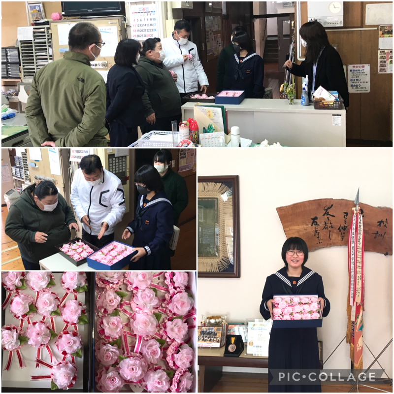 3月24日(水)、1年生女子生徒が、入学式で、新入生が胸につけるコサージュを、何と新入生全員分と職員10名分、手作りで作ってくれました。