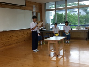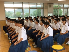 1学期、熊本地震募金活動、体育大会、小学生との交流、毎月の委員会活動、鹿北カップなど、様々な取組を行ってきました。また、学級の課題を見つめ、その課題を解決するための具体的な活動について生徒集会で発表しました。1学期の終わりに当たり、生徒総会で確認した「こんな生徒が集う学校にしよう!」にどれだけ近づくことができたのかを一人ひとりが振り返ってほしいと思います。その振り返りから、2学期の具体的な活動について、生徒会執行部や総務委員会を中心に協議をしてほしいと思います。