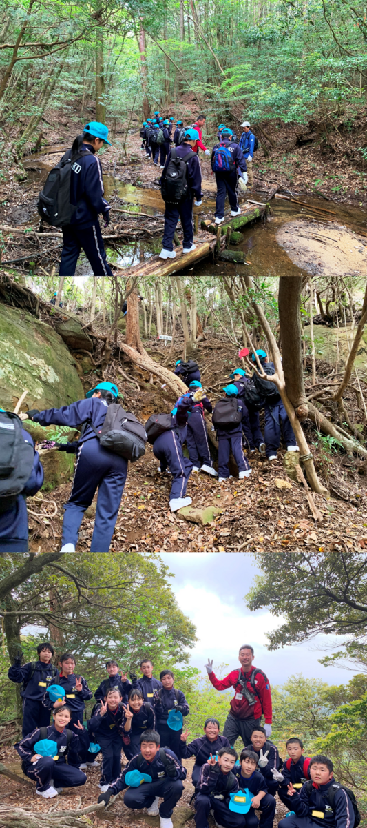後半は、観音岳頂上を目指しました。最後に険しいところもありましたが、みんなで協力し、励まし合って登頂成功。最高に気持ちよかったです。下山後は疲労の表情もありましたが、達成感の方が表情に表れていました。感想では、「きつかったけれど、みんなと一緒だから頑張ることができました」「みんなで声を掛け合って団結することができました」「山頂からの景色がきれいで疲れも取れました」などがありました。素晴しい経験となりましたね。みんなよく頑張りましたよ! 予定よりも1時間ほど早く下山をしたので、この後は遊具などで楽しみます。