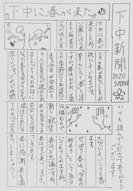 4月6日(月)、今日はうれしい便りが届きました。それは、3月30日発行の「下中新聞」です。