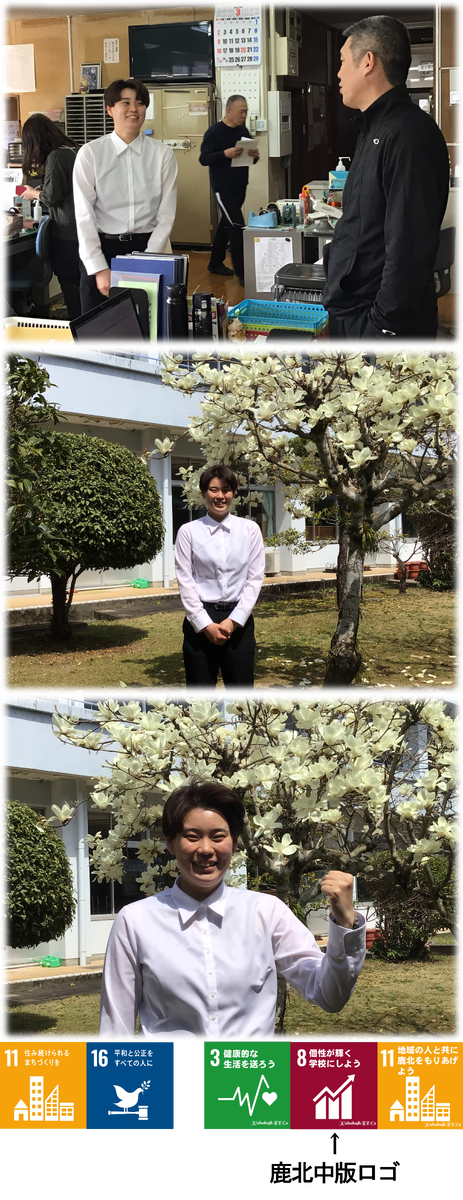 3月25日(火)。今年度教育実習に来られていた先生がご挨拶に来てくださいました。4月から人吉市の中学校で教師として働くとのこと。なんともうれしい報告でした。本校での教育実習の経験が職業選択につながったと思うと感激です。生徒たちも誇らしい気持ちになるのではないかと思いました。先生、4月からの教師としての仕事と新生活をしっかり楽しんでくださいね。鹿北中も応援しています!