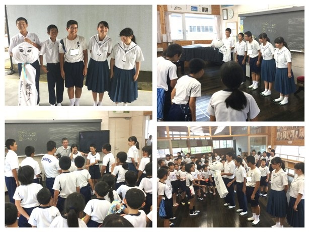 9月14日(木)昼休み、中学2年生の代表生徒が鹿北中に伝わる「巨大てるてる坊主」を鹿北小学校に届けに行きました。鹿北小学校は17日(日)に運動会が予定されています。この運動会には、鹿北中生徒が終日ボランティアとして部活動単位で参加します。また、中学1年生はリレーを行い、その後一人ずつ近況報告をすることになっています。