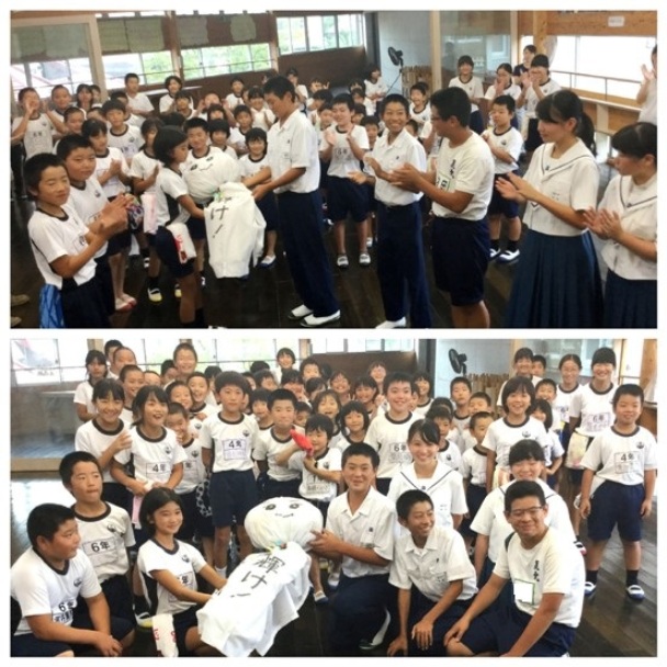 しかし、台風18号が接近しており、予定通りの開催が危ぶまれてきました。そこで、鹿北中に伝わる「巨大てるてる坊主」を小学校に届けようということになりました。代表生徒が小学校に行き、運動会練習をしていた白組の児童に渡すこととなりました。2年生の中島君が「台風が近づいていて心配ですが、僕たちも楽しみにしている運動会ができるように、中学校のてるてる坊主を贈ります。練習頑張ってください」とのメッセージと共に渡しました。小学生は歓声をあげて喜んでくれました。