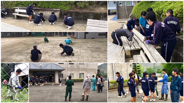 5月24日(木)今朝の全校集会は、「弓道の昇段審査」、「野球部の九電旗山鹿市大会優勝」、「ハンドボール天草桜まつり準優勝」の表彰を行いました。少ない人数でも、日頃の頑張りが確かな成果となって現れたこと嬉しい限りです。後半は5月20日の体育大会の振り返りが生徒会によって進められました。まず代表生徒による作文発表、多くの支えがあったことに改めて気づくとともに、限界の先にあった充実感や達成感をしっかりつかめたことを発表しました。そして、今回の成果を踏まえて日常生活を充実させ次のステップ(中体連や期末テスト)に挑もうと、生徒会より力強く訴えかけました。爽やかな5月の風が心地よく吹き渡る体育館でのひとこまでした。